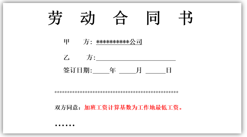 (1)用人单位与劳动者在劳动合同中约定了加班费计算基数的,以该约定为准;双方同时又约定以本市规定的最低工资标准或低于劳动合同约定的工资标准作为加班费计算基数,劳动者主张以劳动合同约定的工资标准作为加班费计算基数的,应予支持。