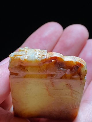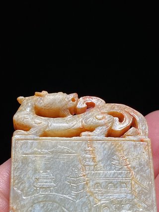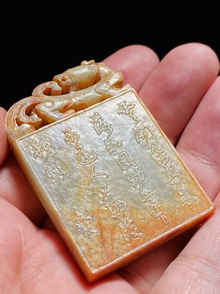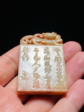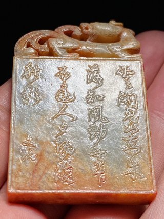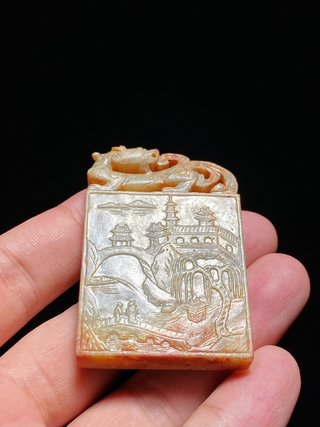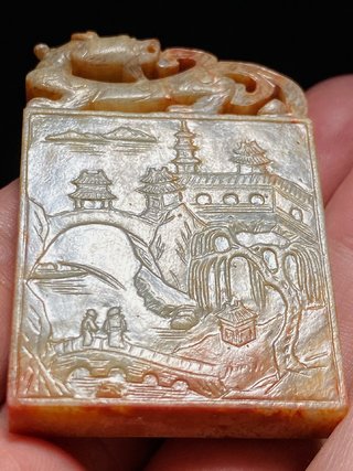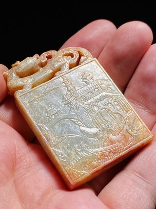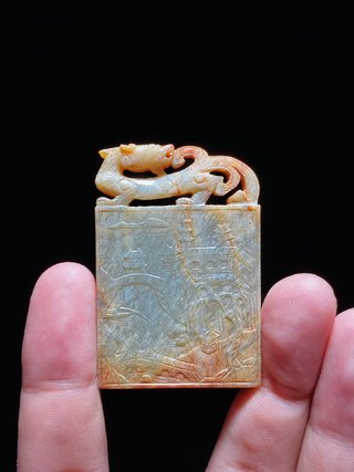 明 和田玉籽料沁色 螭龙纹 山水人物图 诗文牌 文玩牌 长3.8 宽0.8 高5.6厘米 重43.1克 和阗玉质地,扁长方体,黄褐沁色入骨,表面带灰皮。正面以减地浮雕及阴线琢刻山水人物图。前景四孔石桥低卧溪口,二文人相顾而行,右侧柳树高挂,远处山峦迭嶂于湖光山色之间,轻舟一叶,远山隐现,江水浩茫,构图清远淡雅,一派空旷恬淡的境界。空疏简练是明代喜用的构图与刀法,意境空灵,小中见大,用笔简练如刀斫斧劈,此器颇得其妙。背面亦为减地阳起手法琢刻行书诗文“云开见山高,木落知风劲。亭下不逢人,斜阳淡秋影”。诗文后落“文玩”款。此玉牌薄厚适中,造型、雕刻技法以及画面意境等,都体现了典型的明代玉牌的特征,颇具匠心。