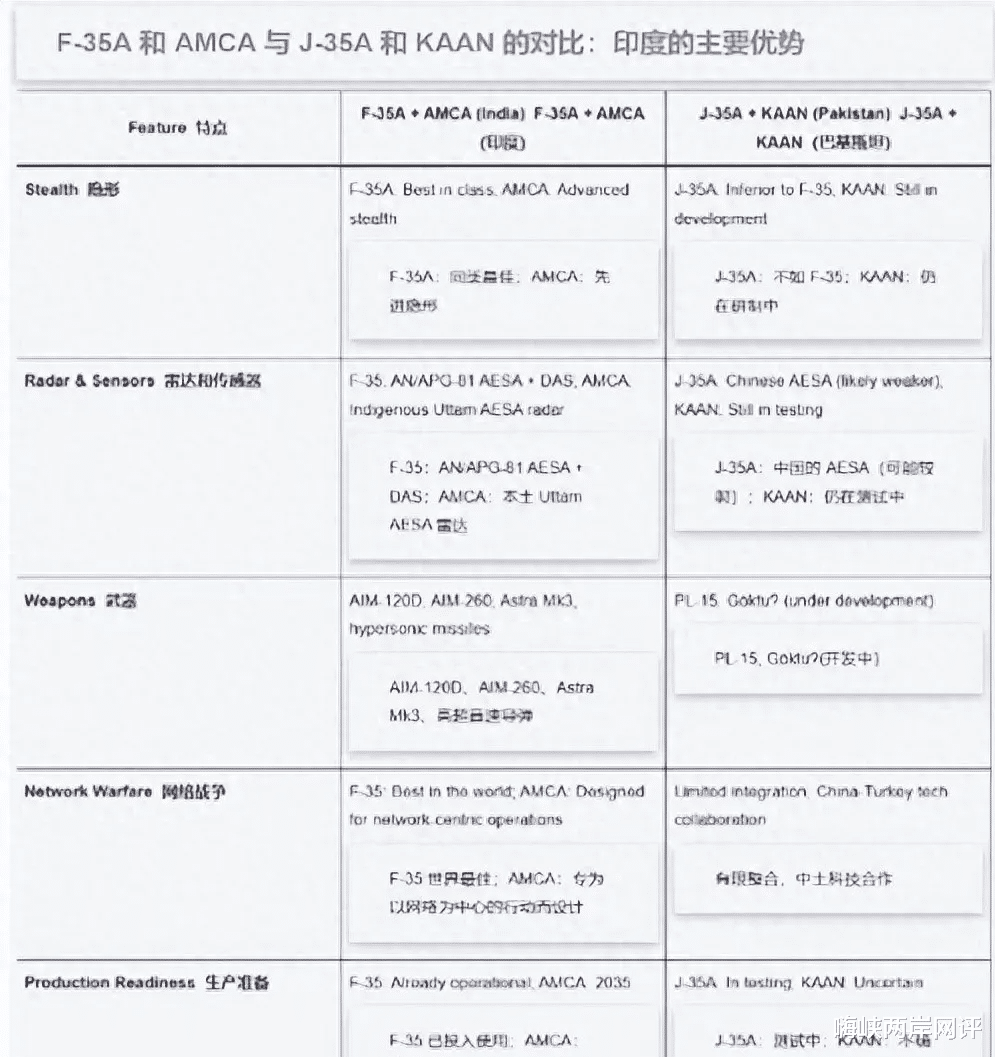 尽管出售F35战机还只是一句空话,并不具备任何协议性内容,但印度媒体已经开始沸腾,并专门制作表格对比F35A跟歼35A的性能,结论也是显而易见的,F35A在各方面均“胜过”歼35A。