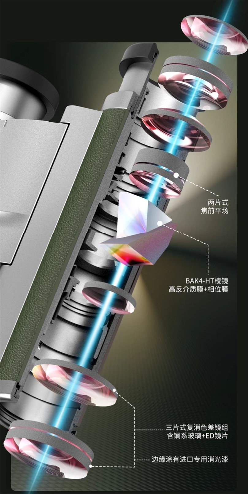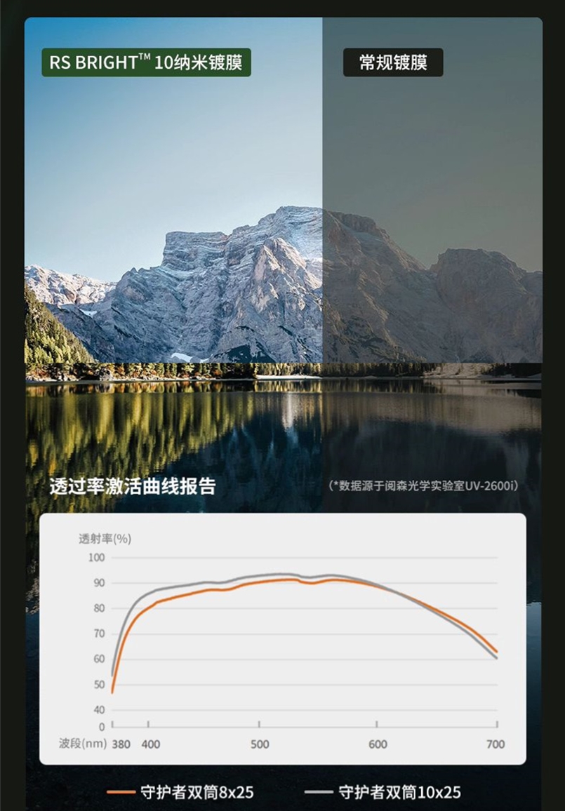 守护者(10×25)采用了先进的光学玻璃材料组合,包括超低色散ED镜片与高折射率镧系玻璃。看远处的时候,不会出现边缘一圈发紫、发绿的情况,画面通透也不会虚。