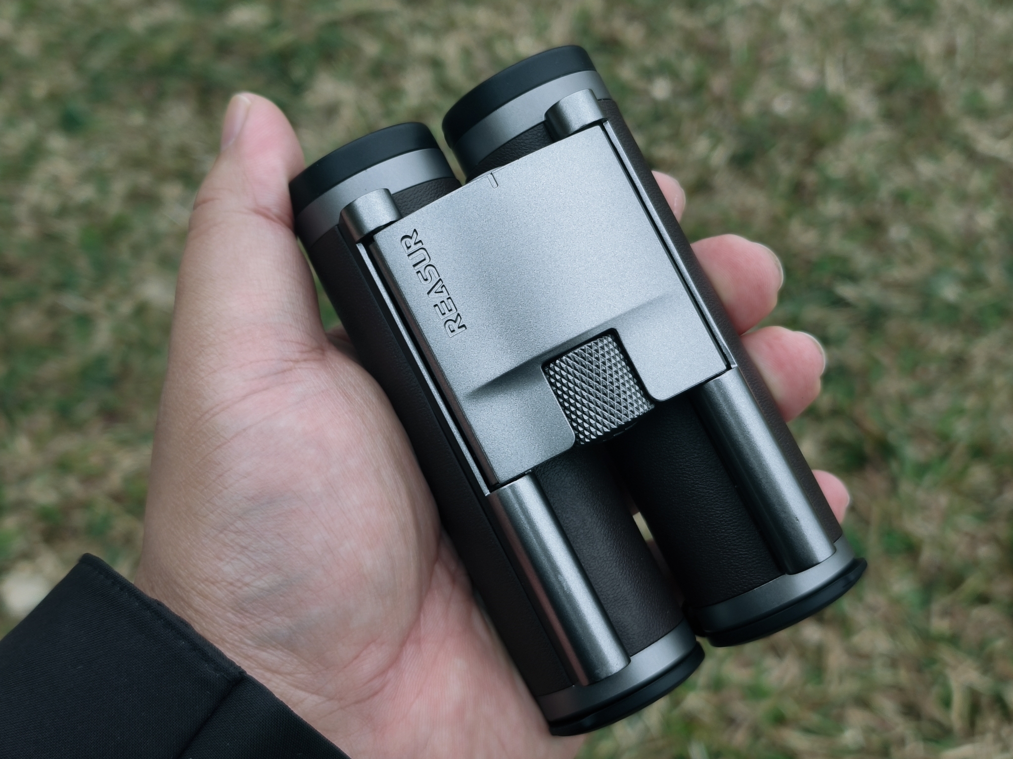 守护者(10×25)采用镁铝合金的主体结构,尺寸上颇为小巧,340g重量,折叠尺寸113×68×48mm,全展开也仅有113×114×41mm,镜身比例收得很紧凑,拿在手里不会有笨重感。