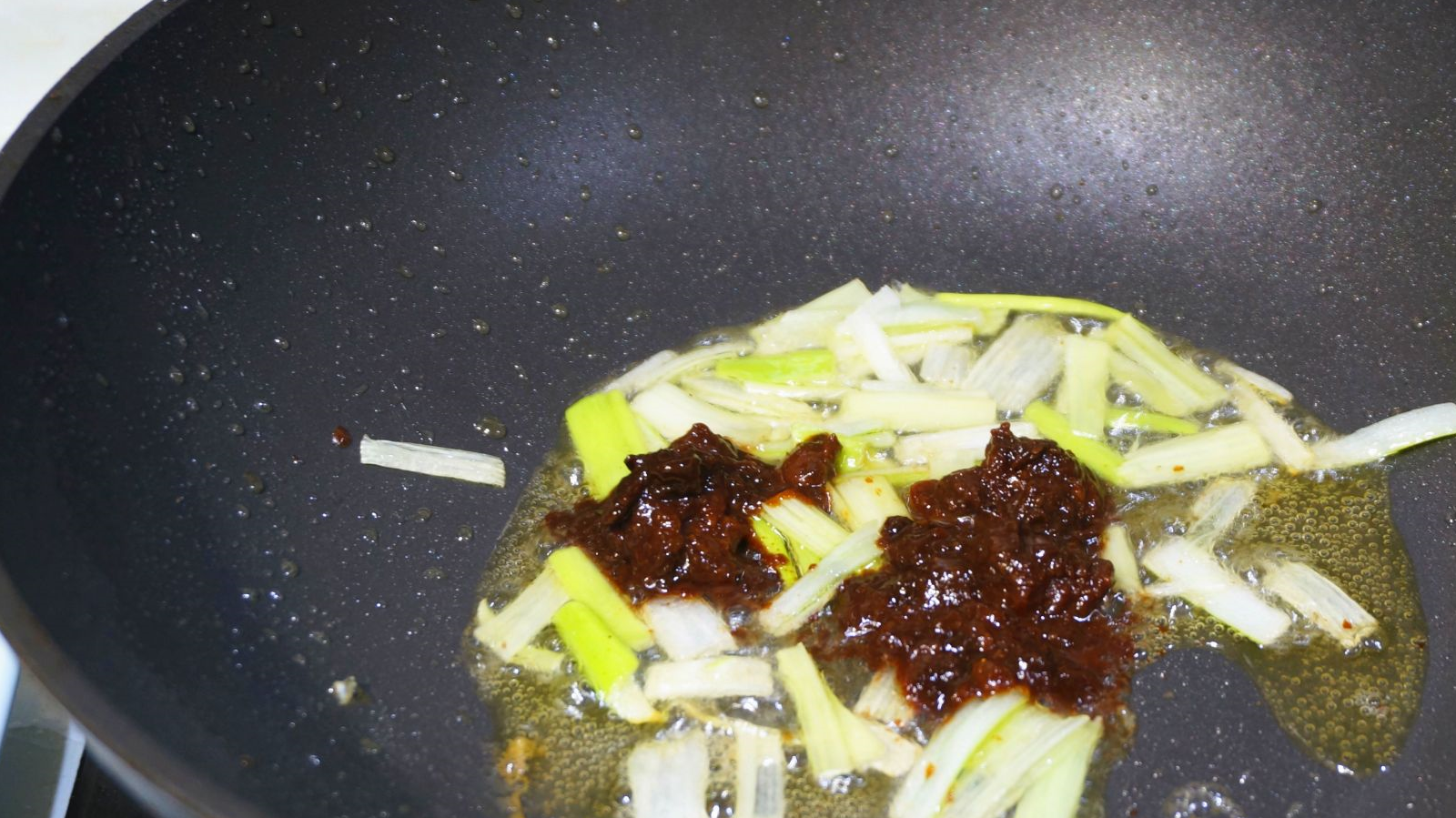 3、把煎鱼的油留一点在锅里,下入大葱和黄豆酱,煸炒出香味,加入适量温水,再把煎好的鱼放进来,加入适量生抽调味,适量料酒去腥,口味淡的话,基本不用额外加盐了,黄豆酱本来就比较咸。