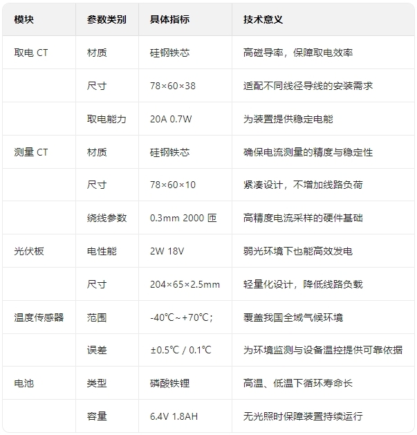 2.传感与测量模块:包含“取电CT、测量CT、温度传感器”三大核心部件。取电CT与测量CT均采用硅钢铁芯,前者以78×60×38mm的尺寸实现20A 0.7W的取电能力,后者则通过0.3mm线径的2000匝绕线,实现对线路电流的高精度测量;温度传感器覆盖-40℃~+70℃范围,误差控制在±0.5℃/0.1℃,为环境与设备工况监测提供可靠数据。