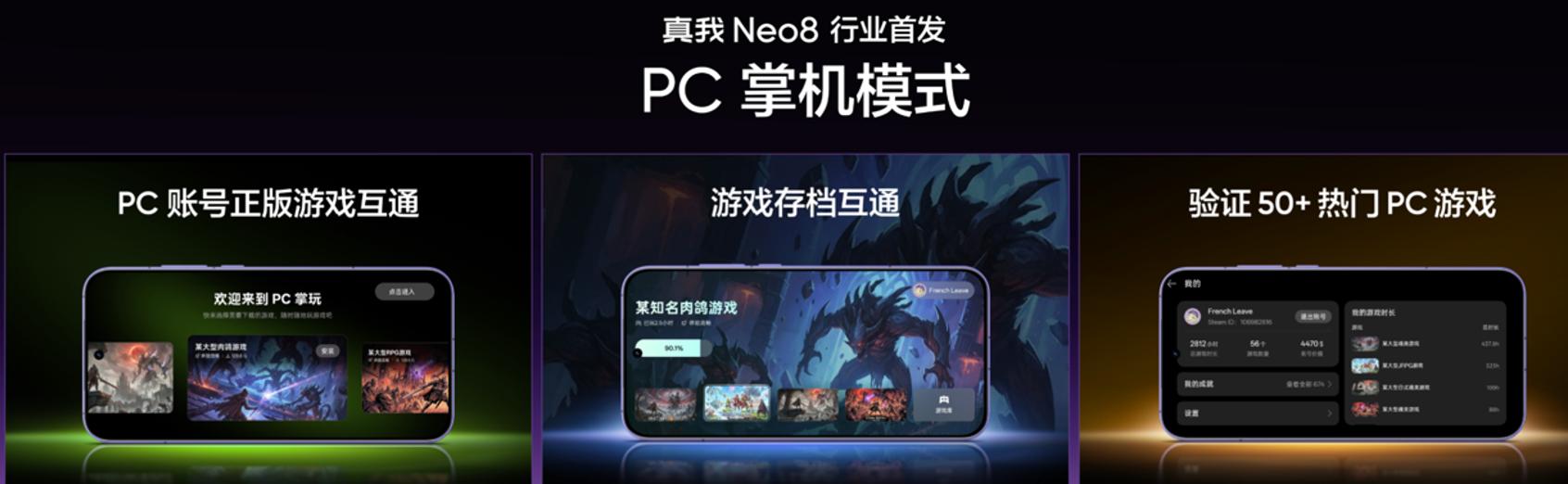 值得一提的是,在游戏方面,真我Neo8行业首发了PC掌机模式,这一模式可以实现Steam账号正版游戏互通与游戏存档互通,已验证可流畅运行超50款热门PC游戏。用户在火车上、飞机上也能畅玩《空洞骑士:丝之歌》《哈迪斯2》《古墓丽影9》等PC大作。