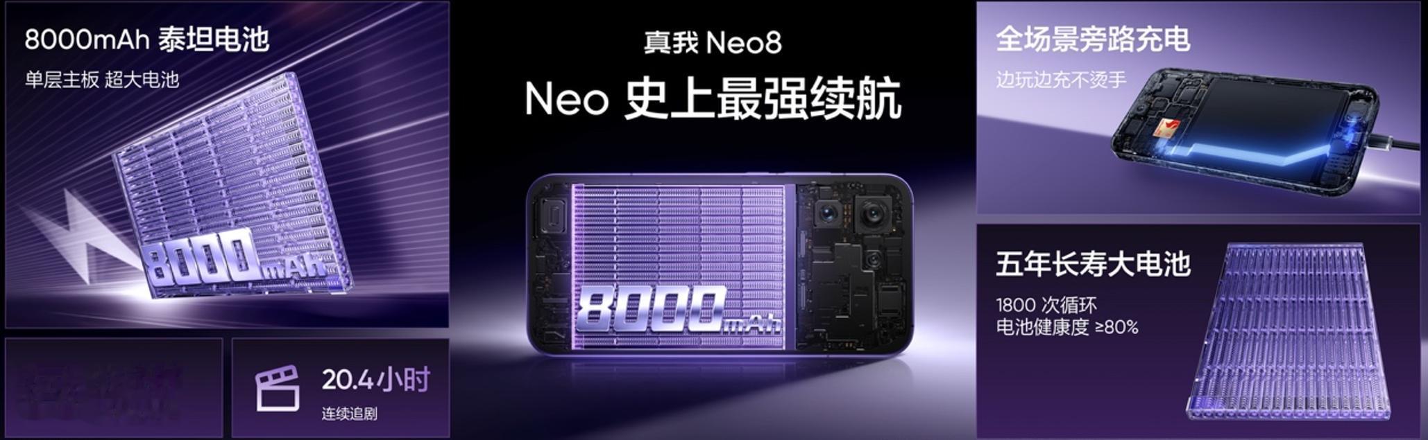 续航方面,真我Neo8配备8000mAh单电芯泰坦电池,突破了目前行业单层主板性能旗舰电池容量上限。