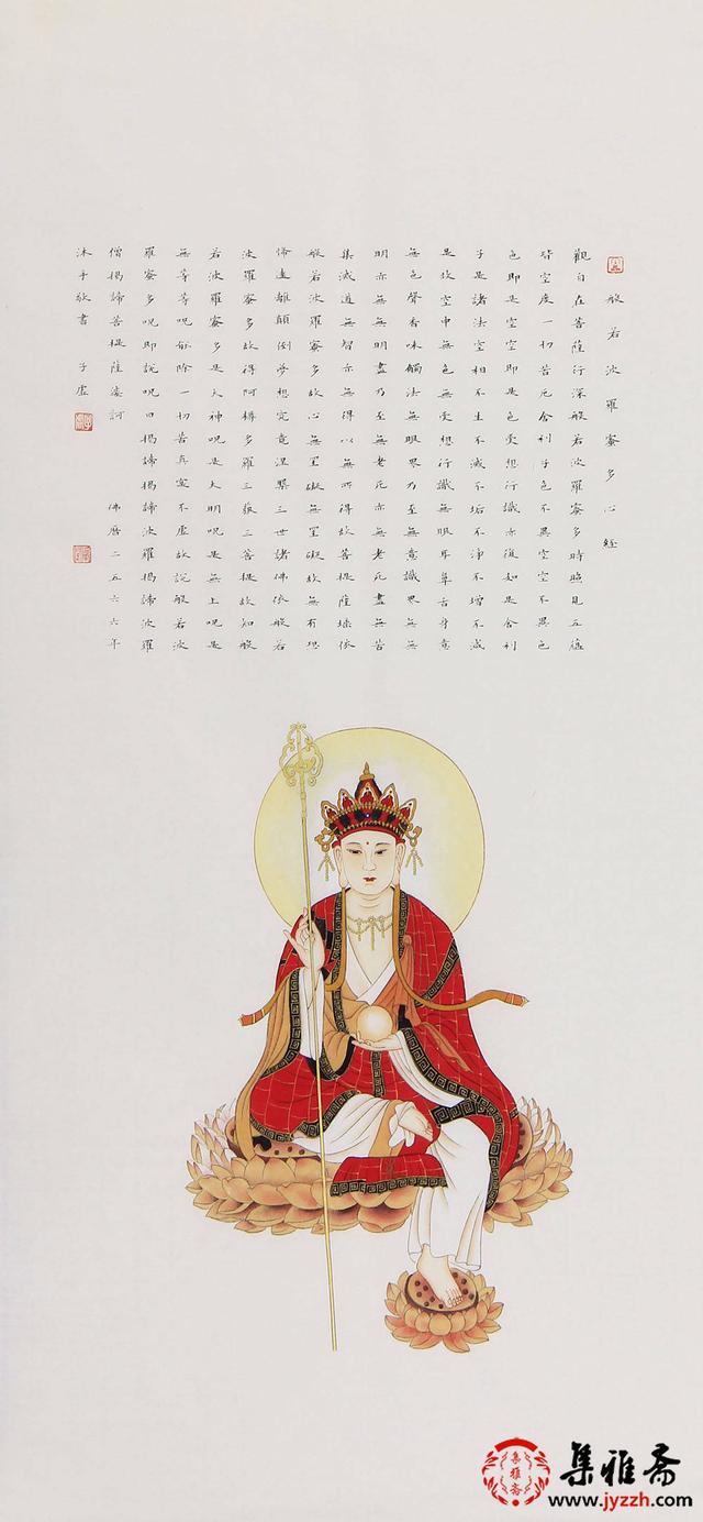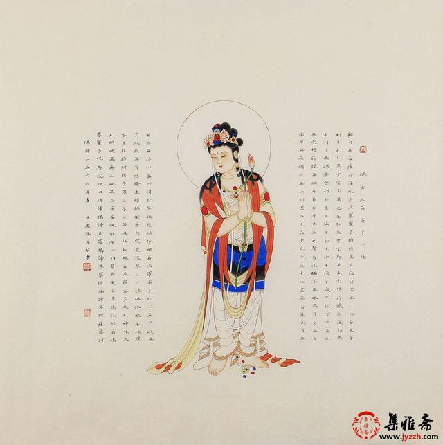 吴子虚的这幅《心经》,以细腻笔触勾勒轮廓,线条流畅且富有韵律,精准呈现观音菩萨的优美身形与宁静神态。色彩运用上,红、蓝、白等色调相互搭配,鲜明却不失和谐,衣饰的细节处精心渲染,凸显质感。书法与绘画融为一体,《心经》字迹工整隽秀,与画面相得益彰,尽显画家深厚的传统绘画功底与书法造诣。