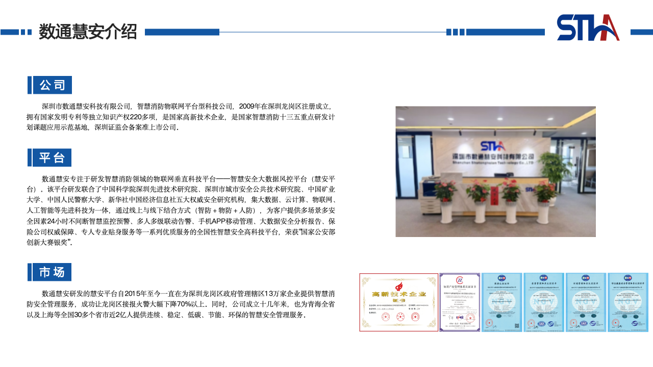数通慧安成立于2009年,是一家定位于“城市消防安全运营服务商”的国家高新技术企业。公司联合中国科学院深圳先进技术研究院、中国人民警察大学等五家权威机构,共同打造了“智慧安全大数据及数字平台”,并荣获国家公安部创新大赛银奖。自2015年至今,该平台已为深圳龙岗区1.3万家企业提供智慧消防安全服务,成功推动区域火警数下降超70%。深厚的行业积累与技术沉淀,为其后续产品研发奠定了坚实基础。