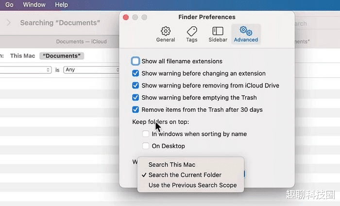 11、搜索限定在当前文件夹会更快更准,按 Command + F 时默认去搜索整台 Mac 会很浪费时间,去 Finder 偏好设置 > 高级,把“执行搜索时”改成“搜索当前文件夹”,以后我们的搜索会更聚焦也更省心;