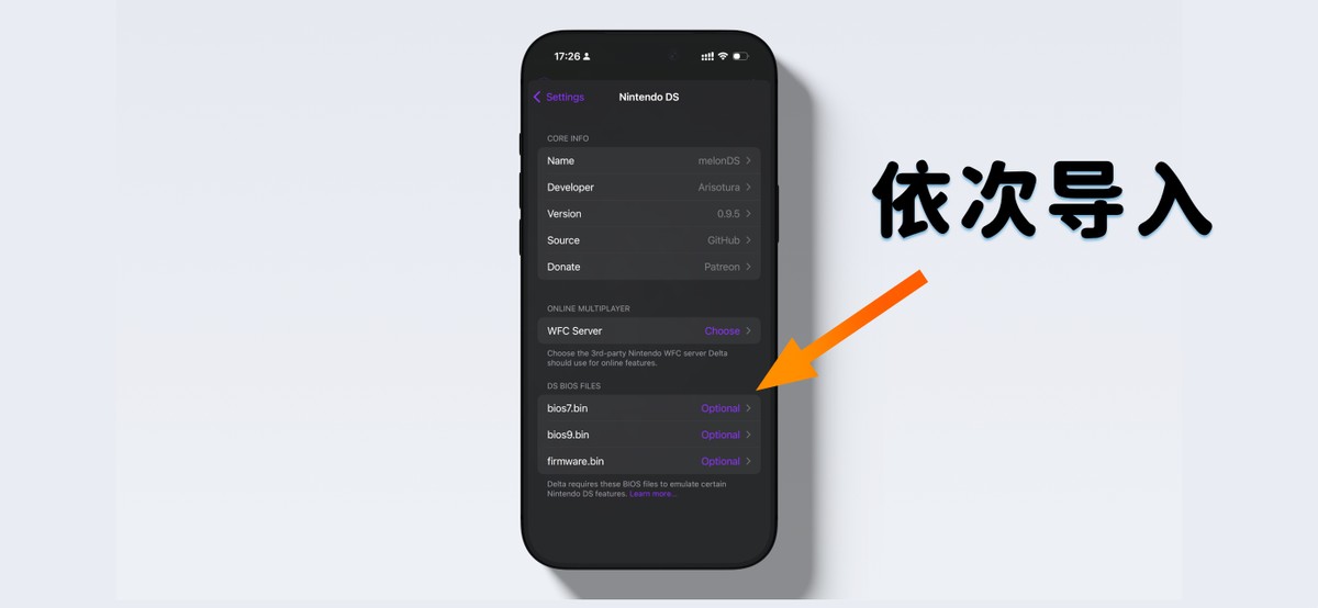 NDS 的 BIOS,一共需要导入 3 个文件,根据 Delta 的提示导入即可。