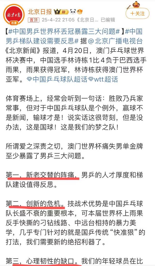 更令人忧心的是,面对雨果的挑战,国乒主力马龙、樊振东竟同时缺席这一重要赛事,而林诗栋等新人在关键比赛中的表现则显示出抗压能力不足。这三大问题——战术被针对、主力缺席和新人抗压差,几乎完美诠释了国乒当前面临的困境。