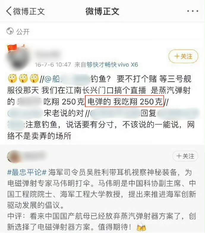 甚至“小馋猫”来了,说:“如果中国航母上了电磁弹射,直播吃250克翔。”