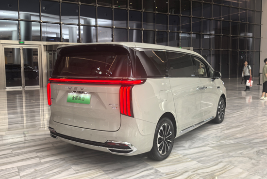 侧面通过熏黑处理的D柱形成悬浮式车顶效果,搭配平直的线条,呈现出修长的车身造型。侧滑门设计兼顾实用性与仪式感,门把手“隐藏”于腰线中,保持简洁的设计风格。尾部采用贯穿式尾灯设计,灯组融入中国传统竹节元素,夜间辨识度极高。尺寸方面,高山7长宽高分别为5050mm*1960mm*1900mm,轴距达到3085mm。