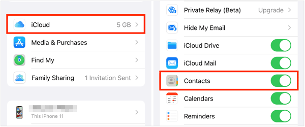 以下是通过 iCloud 将联系人从 iPhone 链接到 iPad 的方法:在 iPhone 上,前往“设置” ,然后点击“ [您的姓名] ”>“ iCloud ”。将“通讯录”开关切换到“开启”位置(绿色)。iPhone 现在会将您的通讯录上传到 iCloud。