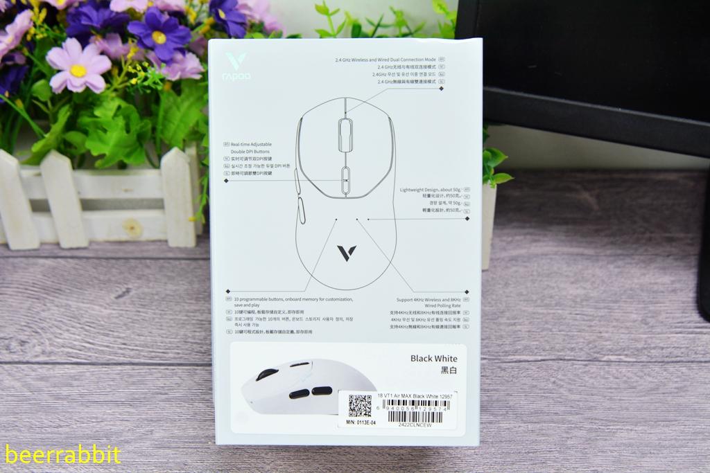 近期,雷柏又发布了一系列VT1 产品,分别是VT1 air max、VT1 pro max,VT1 pro,它们是首批采用原相3950光学引擎的鼠标,在保留了家族式的轻量化、为中小手玩家设计、C+click分离式按键预压校调技术、V+Wireless无线游戏技术等特点外,每款都另外有自己单独的卖点,我有幸拿到了VT1 air max这款轻到极致的产品。