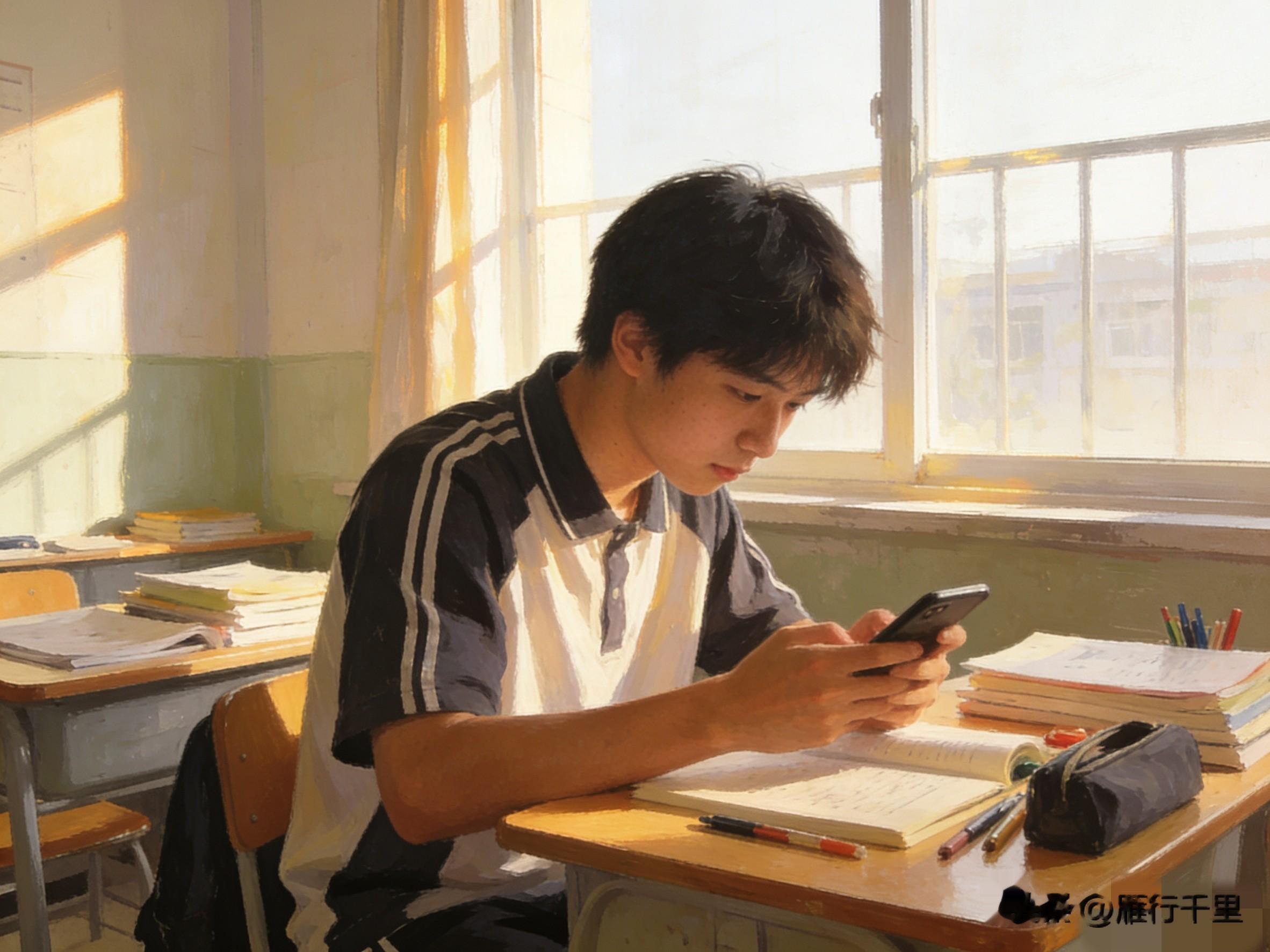 我高中同学的儿子,高二那年他把智能机换成了老人机,晚自习桌上只摆课本和卷子,课间再也不凑堆刷视频了。