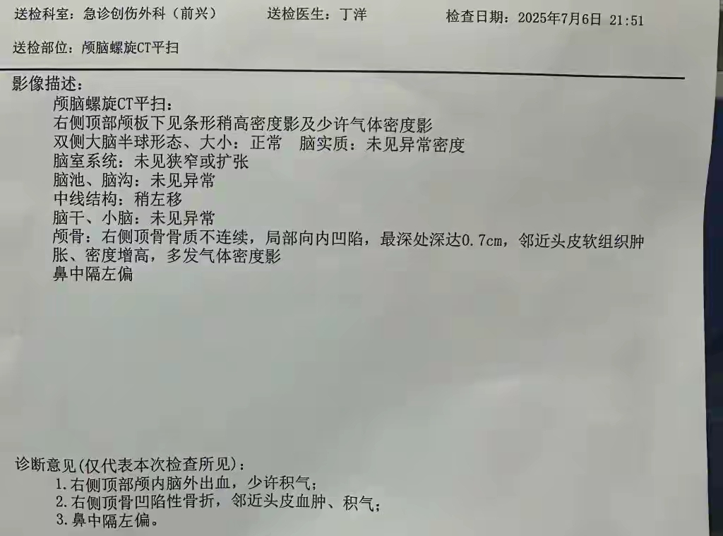 当晚8时许,徐某与老乡在火锅店聚餐时,因“酒未喝完”发生争执。监控显示醉酒的徐某抄起塑料凳砸向同桌高某,凳子在击中目标后反弹砸中小盛头部。男孩瞬间倒地,右侧顶骨凹陷0.7厘米,伴随颅外出血和头皮血肿,经鉴定为轻伤一级。母亲向女士回忆,孩子当时骑车路过被占道的餐桌,突遭飞来的凳子击中,“头上血流不止,连诊所护士都不敢处理”。