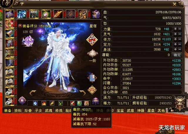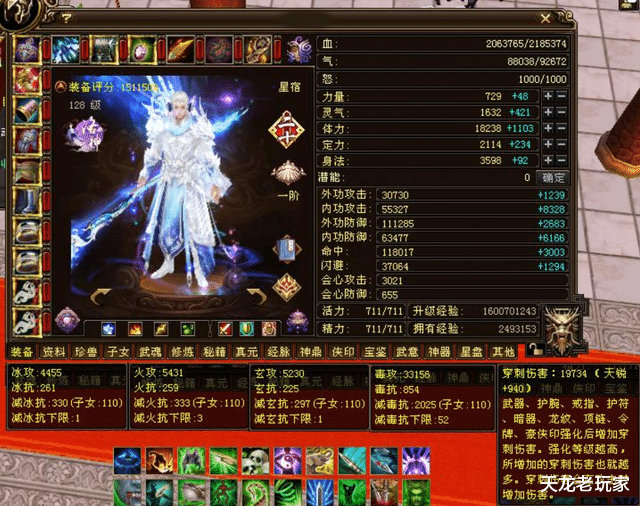 绝对的面板怪,真的很离谱:血量218万,蓝量9.2万,内功攻击5.5万,命中11.8万,闪避3.7万,会心攻击3021,会心防御655,主毒攻击3.3万,同时还有4455冰攻击,火攻击5431,玄攻击5320,同时还有19734的穿刺伤害。