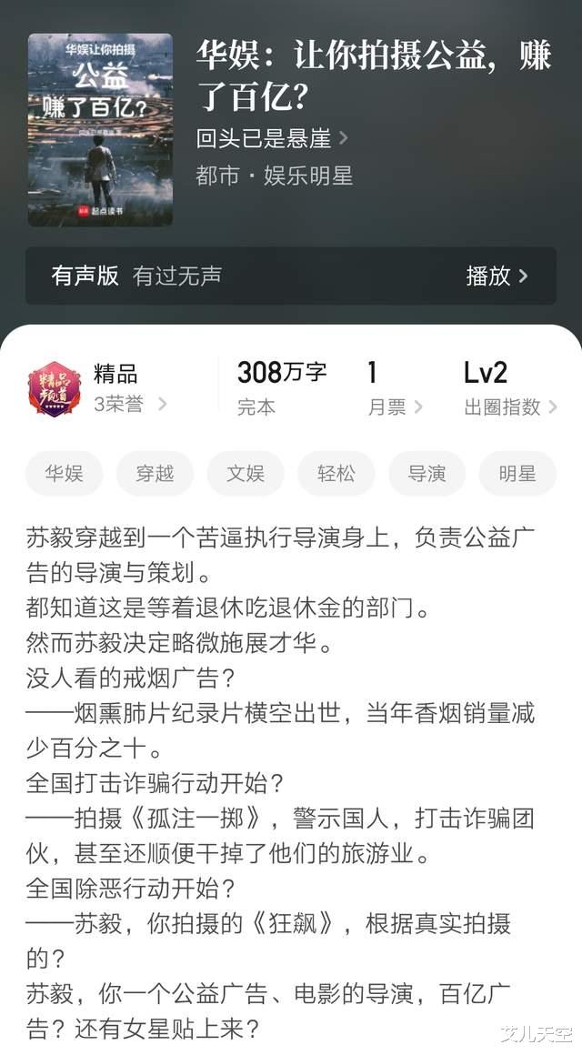 3、《华娱:让你拍摄公益,赚了百亿?》308万字完本完结时间:10月10日