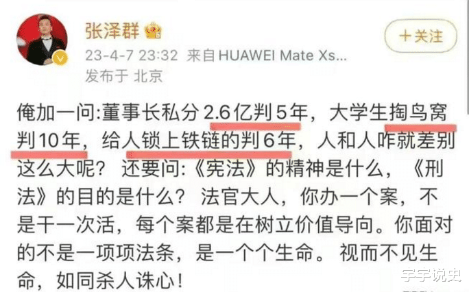最近,前央视知名主持人张泽群被推到风口浪尖,就因为他跨界对司法部门提出了质疑:领导私分2.6亿判5年、铁链绑架判6年、大学生掏鸟窝判10年,人的差距太大了。其实问的问题并不特殊,这就是当下司法现状:峻法治民,宽典治吏,罪责刑不均衡。 只是作为公众人物,说出了很多人想说又不敢说的问题。难免会受到一些人的抨击和指责。