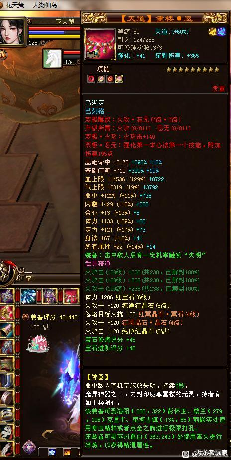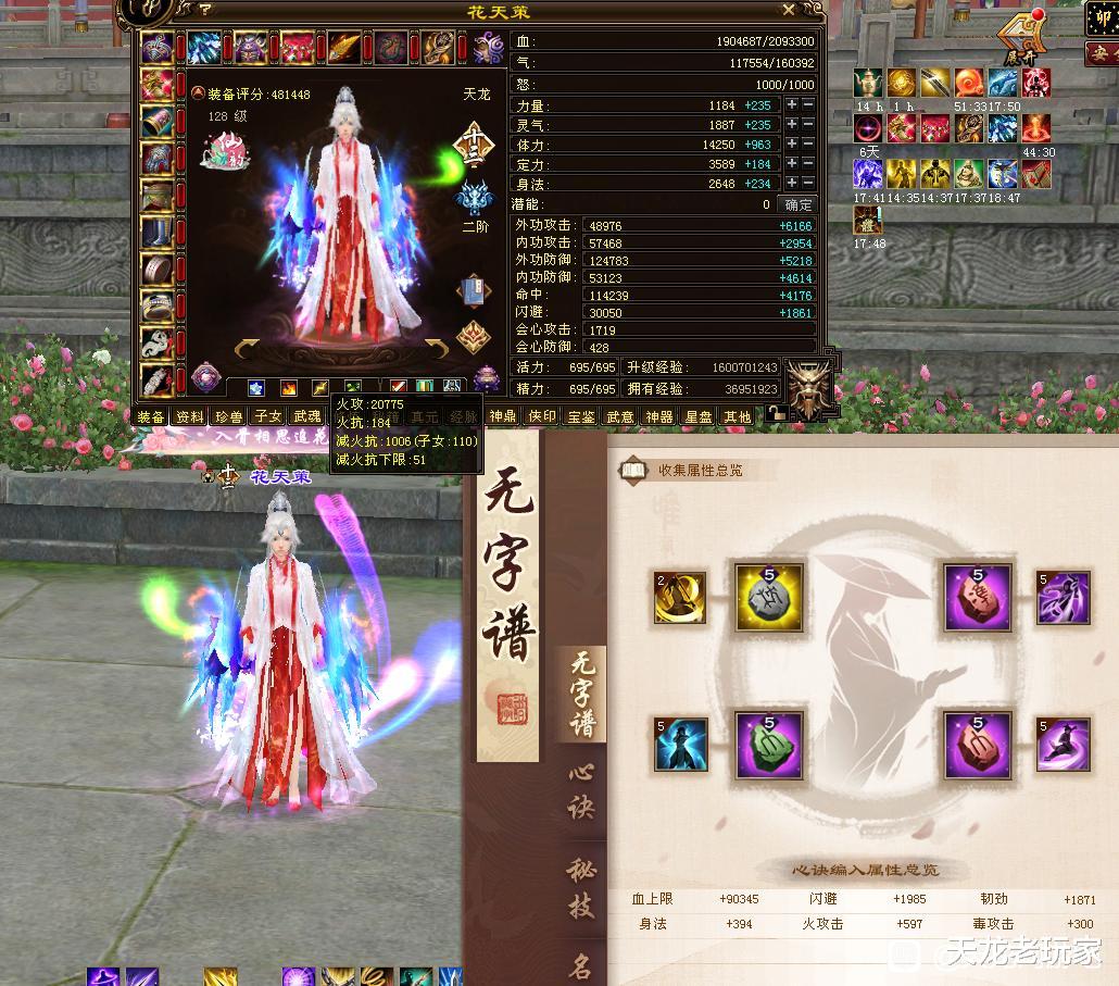 评分48万的天龙,还是双重楼的:血量209万,蓝量16万!命中11.4万,闪避3万,会心攻击1719,会心防御428,主火攻击20775,减火抗1006!