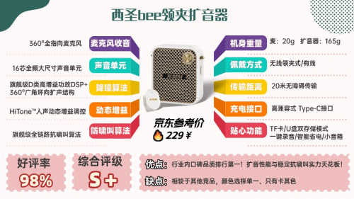 推荐一:西圣bee无线领夹扩音器综合评级:★★★★★推荐理由:行业内口碑品质排行第一!扩音性能与稳定抗啸叫实力天花板!
