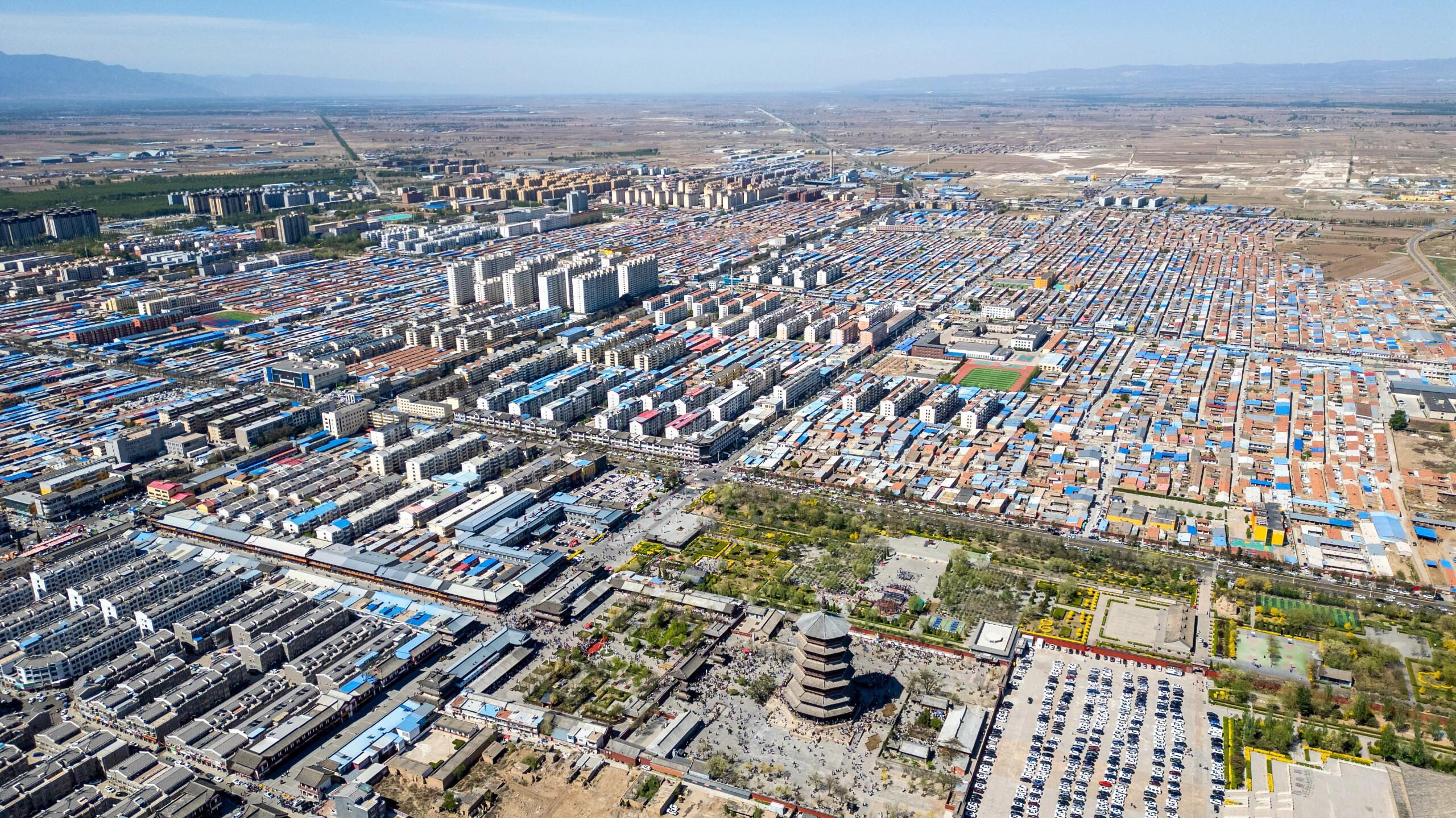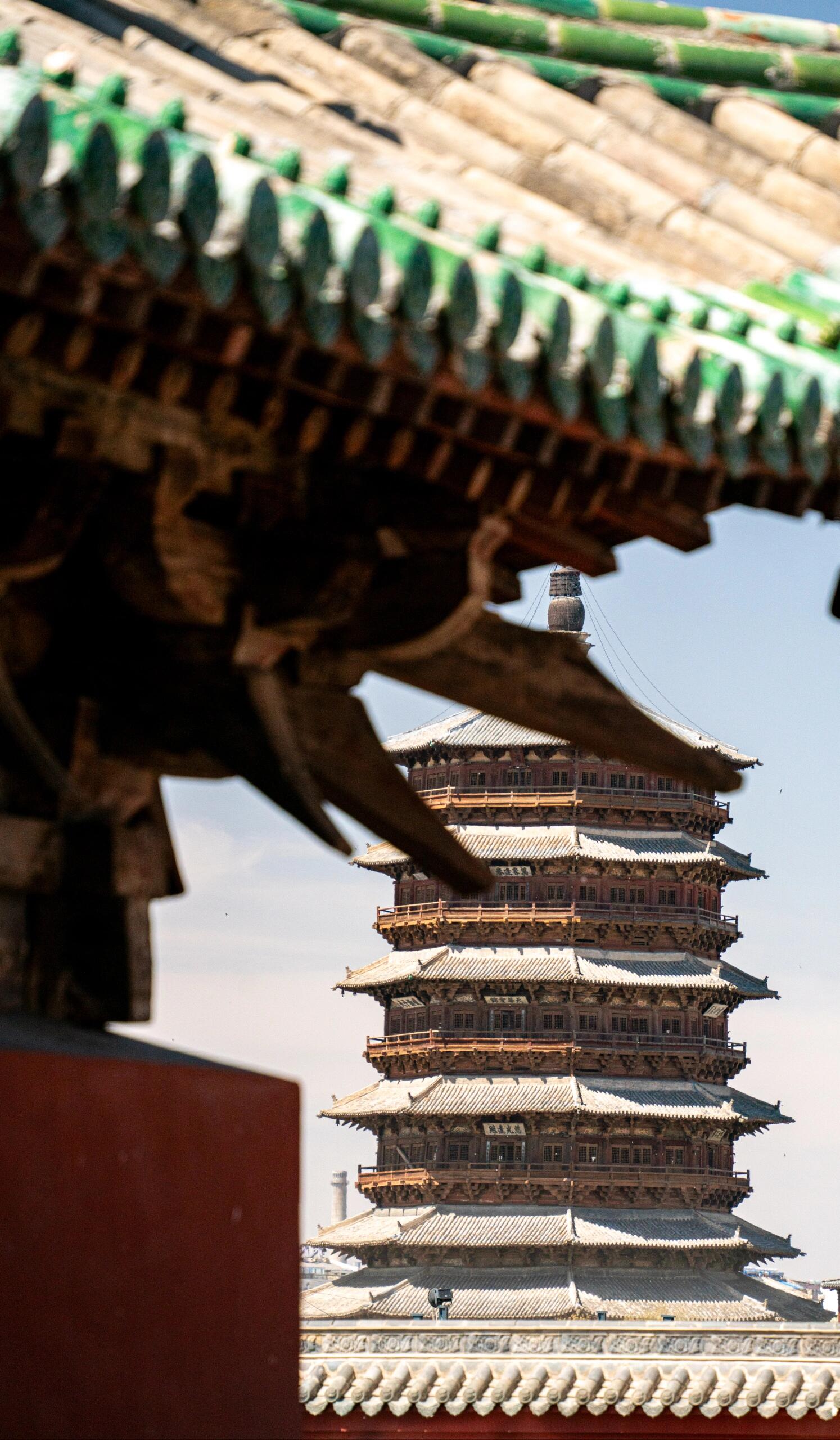 站在山西应县佛宫寺的山门前仰望,67.31米高的木塔刺破云霄,八角飞檐层层收束如莲瓣舒展,檐角风铃轻颤,恍若千年前的晨钟