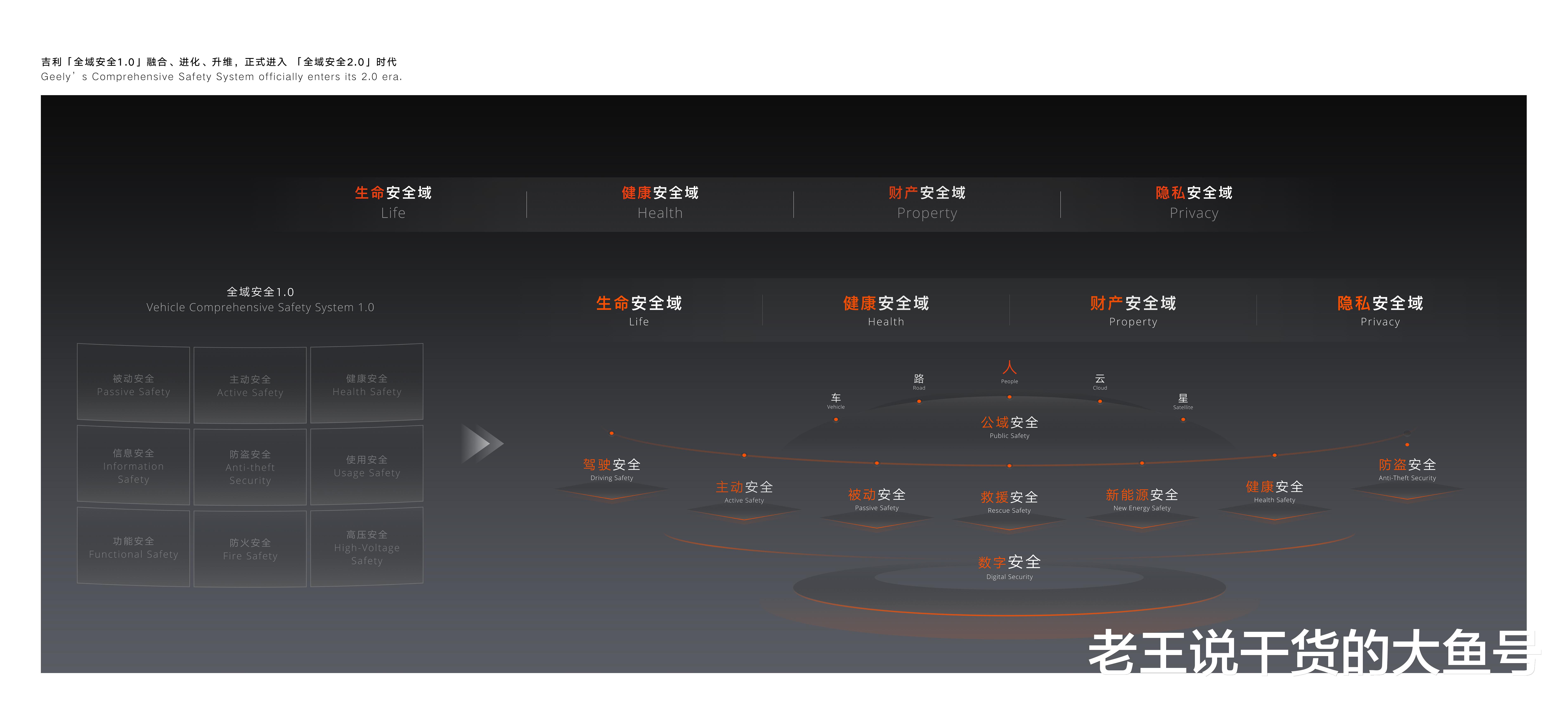 作为行业安全技术的先行者与引领者,吉利在“全域AI”技术体系的赋能下,以“AI为纲 责任为本”,基于原有的“全域安全”技术体系进阶打造“全域安全2.0”技术体系。结合智能时代的安全新需求和新挑战,“全域安全2.0”技术体系秉持“以人为尊”理念,通过技术升级、能力突破与范式创新,将侧重“整车安全”的视角升级为“人-车-路-云-星”的生态视角,旨在贯穿用户出行全场景、覆盖出行全领域、联动出行全生态;并以“生命零伤亡、健康零危害、财产零损失、隐私零泄露”四大安全愿景为指引,逐步构建的一套为消费者提供全面的安全保障技术体系。
