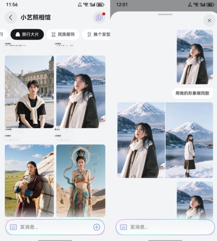 小艺照相馆Agent的魅力远不止于此,它深知年轻人爱玩、爱表达的心。除了经典的世界地标“旅行大片”,它还能带你体验各种有趣的身份和风格穿越。