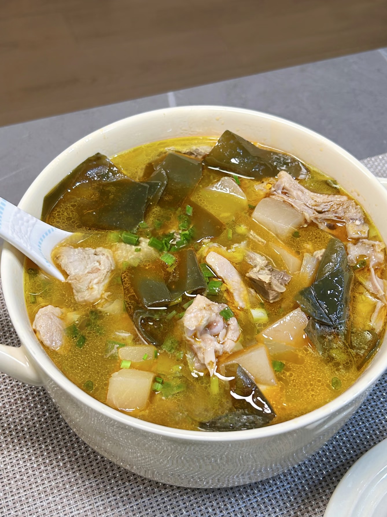 盛汤也有仪式感。先捞海带结垫底,再堆几块酥烂的鸭,最后浇上金黄酸爽的汤,撒葱花、香菜、白芝麻,一碗“秋冬小太阳”完成。第一口别急着吹,轻轻啜,酸味像小精灵先跳出来叫醒味蕾,紧接着鸭油的醇香滑过舌尖,海带的海洋气息在喉咙回甘,三重奏层层递进,额头秒出细汗,寒气瞬间清零。配菜只需一锅米饭,把汤浇上去,米粒吸饱酸香,我能连吃三碗不带停。