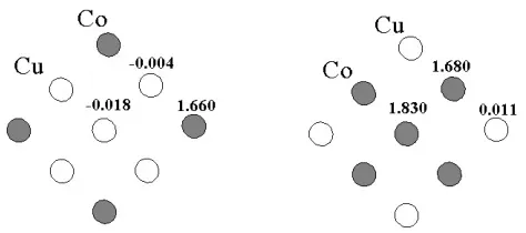 类似地,Co-Cu合金簇磁矩分布图显示表面Co原子磁矩高达1.66μB,而内部Cu原子磁矩接近零,揭示磁性源自过渡金属d电子。