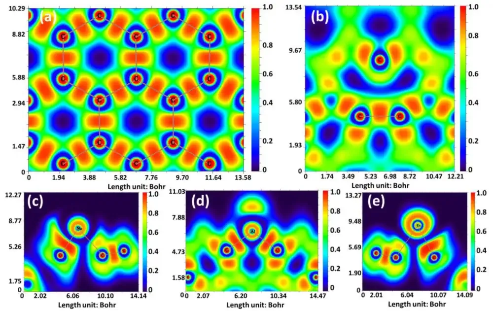 电子密度分布图(如二维材料示例)直观显示电荷空间聚集情况:高密度区对应化学键或原子核位置,低密度区为间隙区域。