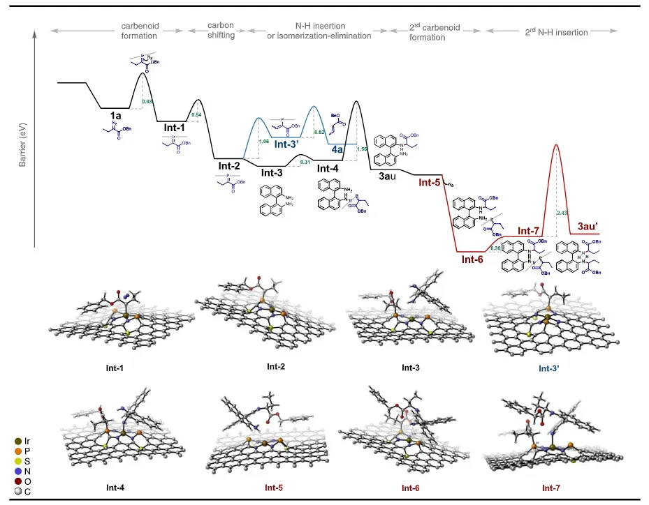 其中,关键的决速步骤出现在Int-2转变为过渡态TS1阶段,其能垒高达0.8eV,对整体反应速率具有决定性影响。能垒的高低反映了该步所需的激发能大小,是优化催化剂和反应条件的关键参数之一。