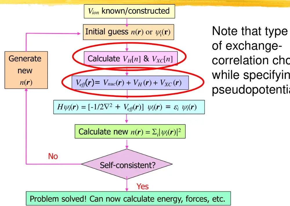 Kohn-Sham方程的巧妙之处在于将多体相互作用全部压缩进交换关联泛函Exc[ρ]中,而Vxc=δExc[ρ]/δρ。该方程需通过自洽场(SCF)迭代求解:初始猜测密度→计算有效势→求解方程→更新密度,直至能量收敛(通常要求ΔE<10< span>-5eV)。