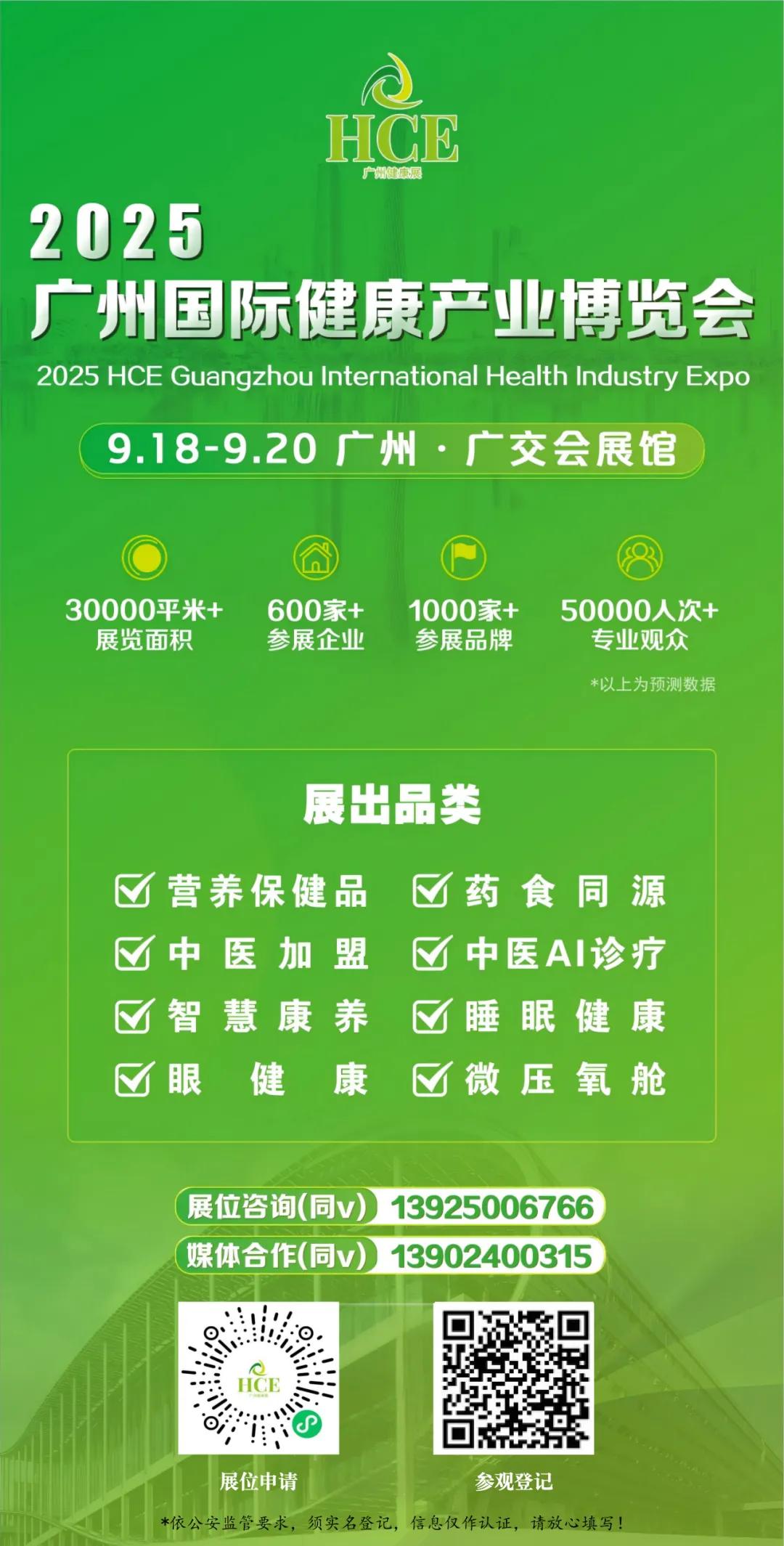 2025HCE广州国际健康产业博览会,将于9月18-20日在广州·广交会展馆举办。展会由广东省保健协会、广州佰威国际展览有限公司联合主办,涵盖营养保健品、药食同源、中医加盟、中医AI诊疗、微高压氧舱、睡眠健康、眼健康、氢健康产品等众多领域,多年来受知名品牌及专业观众关注与支持,是极具影响力的行业盛会。
