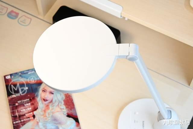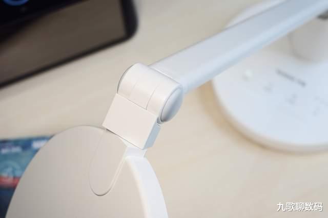 整灯具体尺寸为405*180*421mm,并不算特别大,所以不会占据书桌那本就捉襟见肘的不多空间。臂身和底盘都很粗壮,摆在桌面上调节高低时很稳固。灯臂上下俯仰间的角度很大,得益于“大球关”,在调节时也不会有晃动。