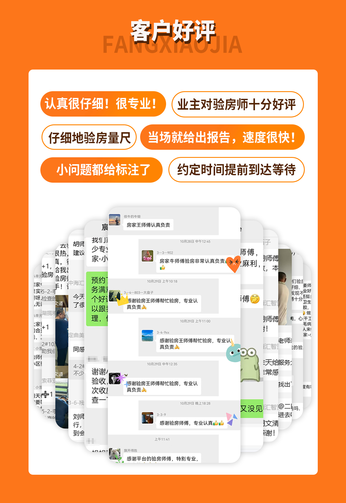 房小家的专业验房服务,不仅收获了业主的一致好评,更成为行业内的口碑标杆。上海业主李女士评价道:“选择房小家验房真是明智的决定!验房师持证上岗,全程专业细致,连墙面空鼓、电路隐患这些细节都精准检出,报告图文并茂特别清晰。相比其他平台,他们不推销合作装修,真正站在业主角度把关质量。当天就拿到加盖公章的正式报告,开发商维修时心服口服。资质靠谱、服务透明,强烈推荐给所有买房的朋友!