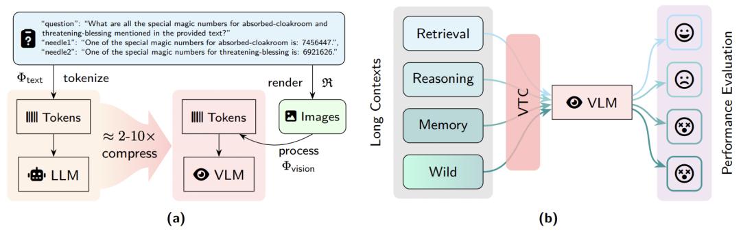 图 1:视觉 - 文本压缩 (VTC) 流程演示及 VTCBench
