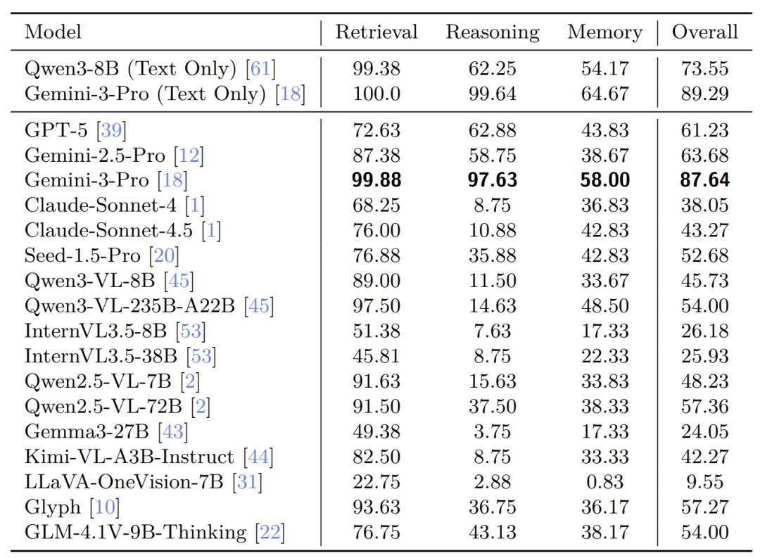 Gemini-3-Pro 在 VTCBench-Wild 上表现惊艳,其视觉理解能力已几乎追平其纯文本基准,证明了 VTC 是实现大规模长文本处理的极其可行的路径!