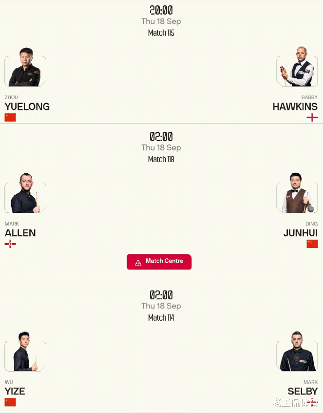 接下来16进8的比赛对阵如下:佩奇迎战墨菲,吴宜泽挑战塞尔比,周跃龙对阵霍金斯,布雷切尔面对罗比·威廉姆斯。下半区特鲁姆普与斯莱瑟交锋,丁俊晖将与马克·艾伦争夺八强席位,沃顿对阵杰克·琼斯,利索夫斯基迎战亚伦·希尔。