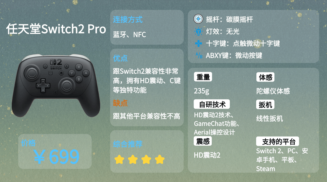 连接性能:核心操控上,摇杆顺畅精准,按键微动干脆。HD震动升级,沉浸感更强,新增GL/GR自定义背键与C键语音功能,提升操作效率。但没有采用霍尔摇杆,有轻微漂移风险,耐用性一般。支持一键唤醒主机,内置耳机接口,生态比Joy-Con完整,仅重量厚度略增。续航与连接稳定,适合偏好动作、弹道操作类游戏类游戏,追求操控感的玩家。