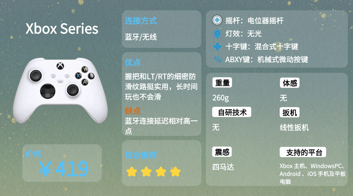 连接性能:连接与功能体验在同价位中表现出色:2.4G模式下延迟几乎难以感知,蓝牙模式适配移动设备,稳定性良好。震动支持Xbox原生马达,细节反馈丰富,比如赛车游戏中不同路面的震动差异能清晰区分。续航配备1000mAh电池,实测可连续使用十多个小时,且支持边充边玩,不会中断游戏节奏。语音控制是亮点,在PC端能识别“开始游戏”“暂停游戏”等指令;同时拥有微软Xbox官方授权,连接Xbox主机、PC、安卓设备均无兼容性问题。