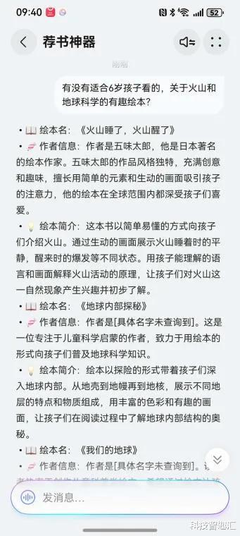 比如那天,孩子正对着动画片里的火山爆发场面惊叹,我立刻抓住机会问荐书神器Agent:“有没有适合6岁孩子看的,关于火山和地球科学的有趣绘本?”它很快推荐了《火山睡了,火山醒了》《地球内部探秘》等绘本,还对每本绘本进行了简单介绍,方便我根据孩子的喜好选择。