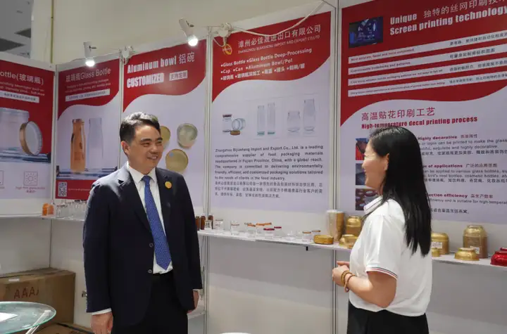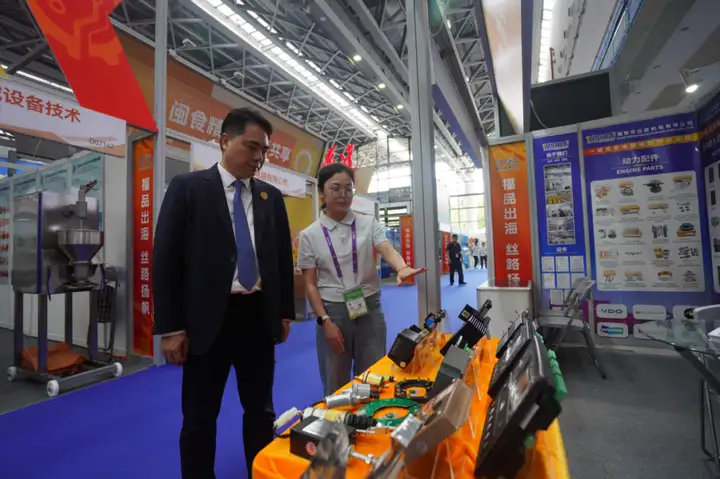 ▲福建省副省长魏晓奎察看外贸优品展区、智能装备(食品加工及包装设备)展区、绿色建材与智能家居展区等,并与参展企业亲切交流。