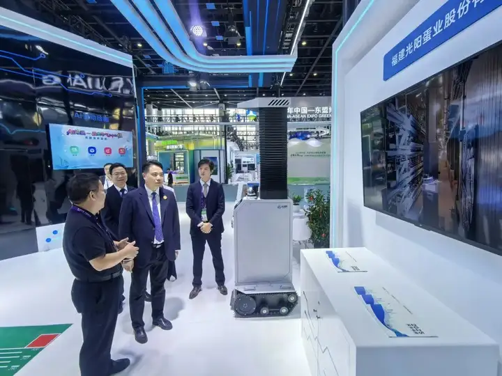 ▲福建光阳蛋业股份有限公司董事长余劼向魏晓奎副省长介绍其自主研发的蛋禽养殖机器人“木鸡郎”。
