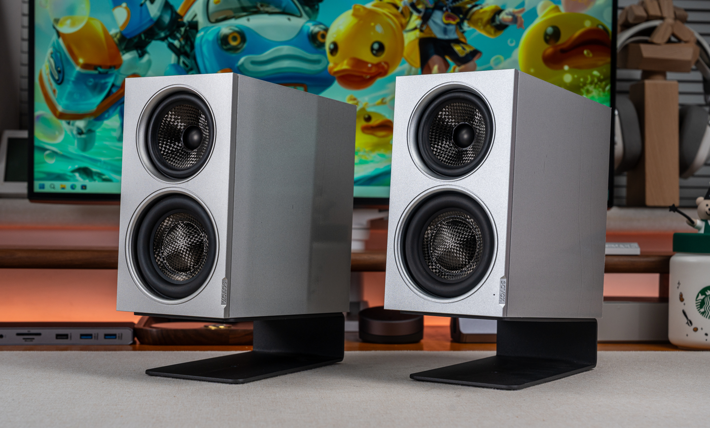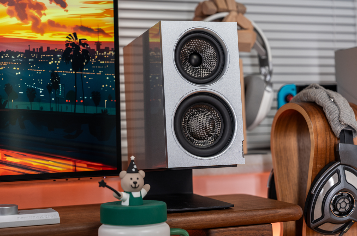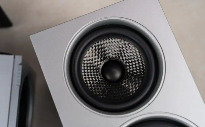 除了外壳外,两个喇叭单元的振膜都是碳纤维材质的,映着灯光呈现出一种十字交叉的光影,配合铝合金的金属外壳,非常精致。尤其是它的正侧面没有一颗螺丝,非常极简,任何桌搭环境都能很好适配。单从外观来看,你很难想象出这是一家国内企业做的产品,不是崇洋媚外,确实国产hifi产品相比国外的来说,在外观审美和精致度上还有很长的路要走。