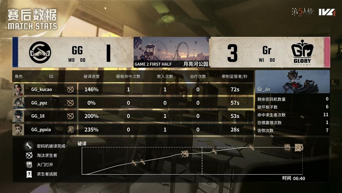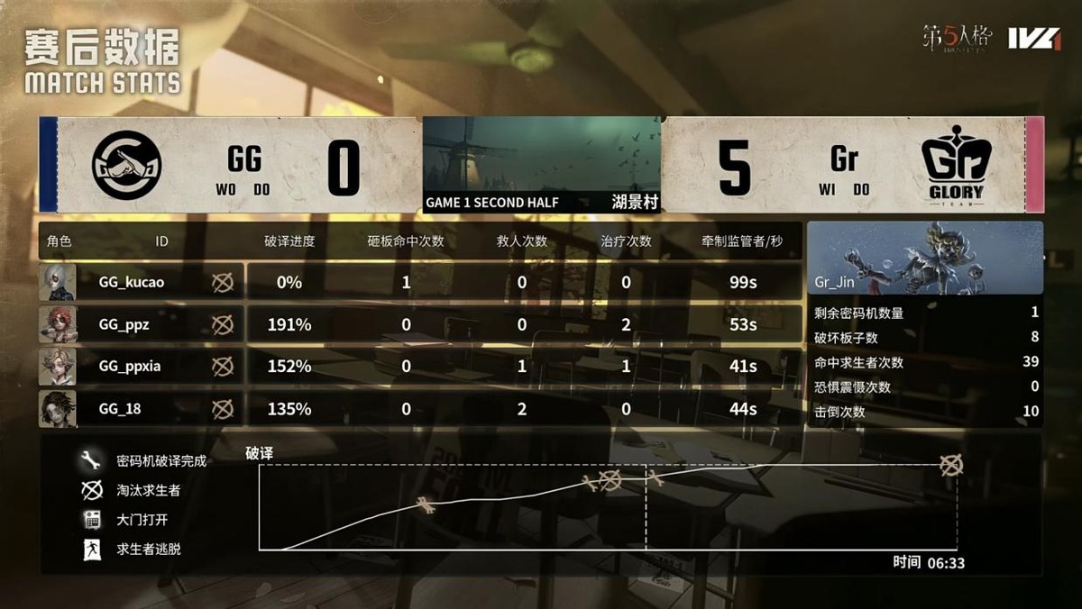 成都GG的求生者选择了病患、空军、火灾调查员、大副(BAN“跛脚羊”);Gr的监管者Jin选择了歌剧演员。(BAN先知、古董商、佣兵、入殓师)