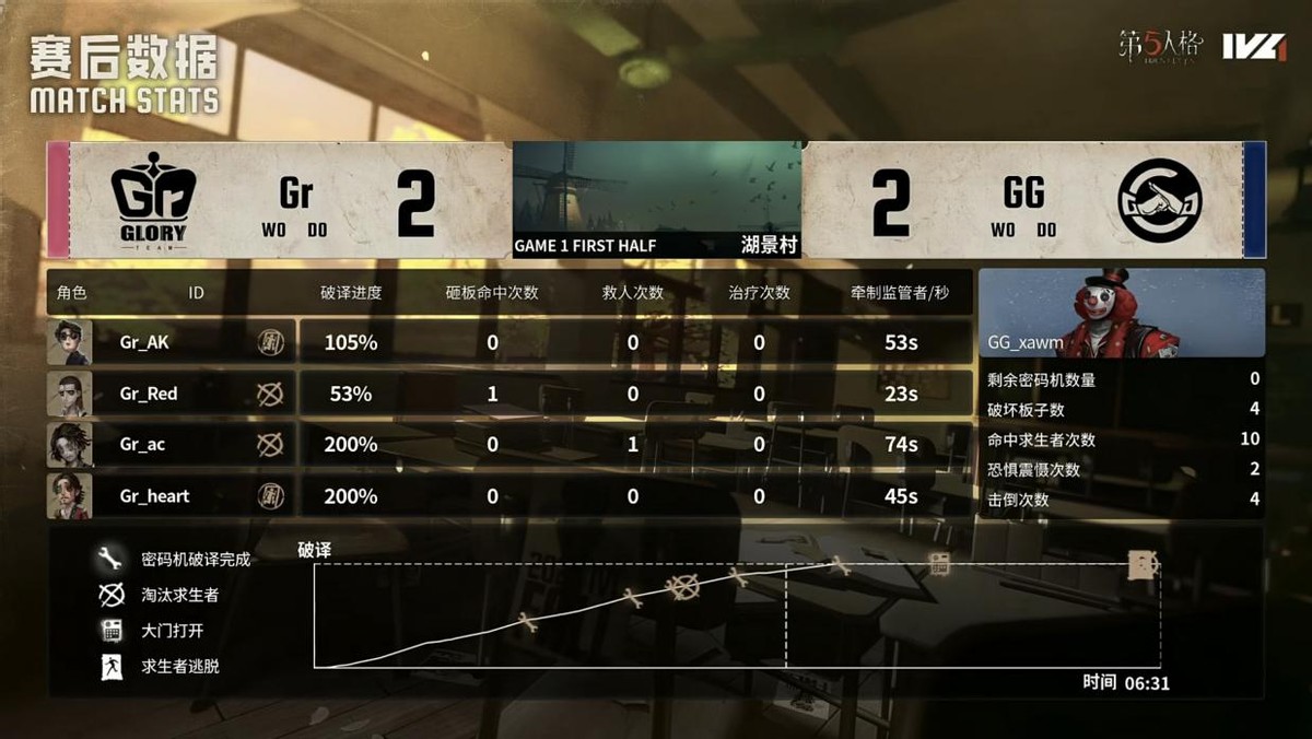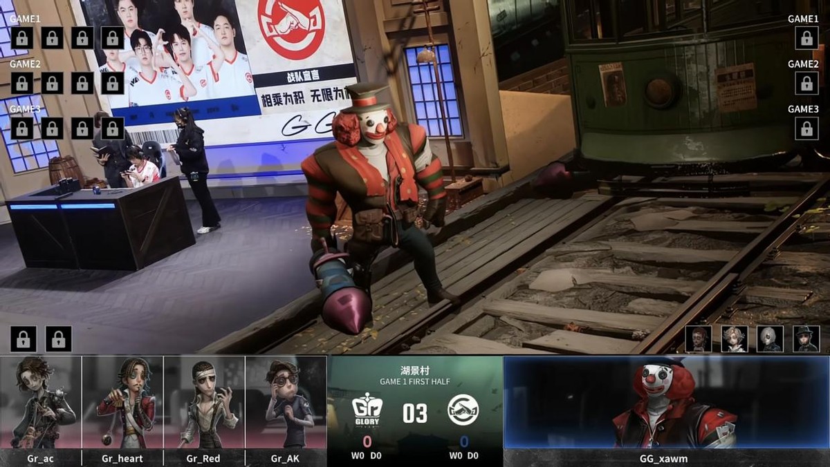 Gr的求生者选择了木偶师、大副、教授、幸运儿;成都GG的监管者xawm选择了小丑。(BAN咒术师、气象学家、守墓人、魔术师)