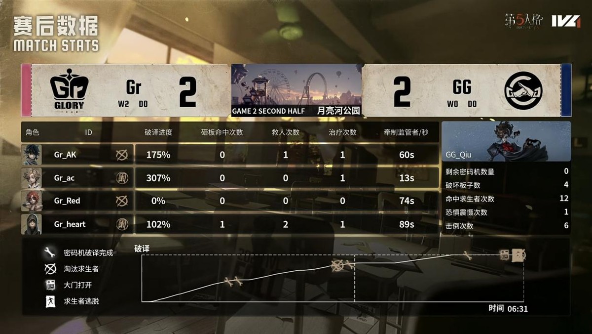 Gr的求生者选择了气象学家、佣兵、弓箭手、病患(BAN“跛脚羊”);成都GG的监管者Qiu选择了歌剧演员。(BAN先知、古董商、火灾调查员、“小女孩”)