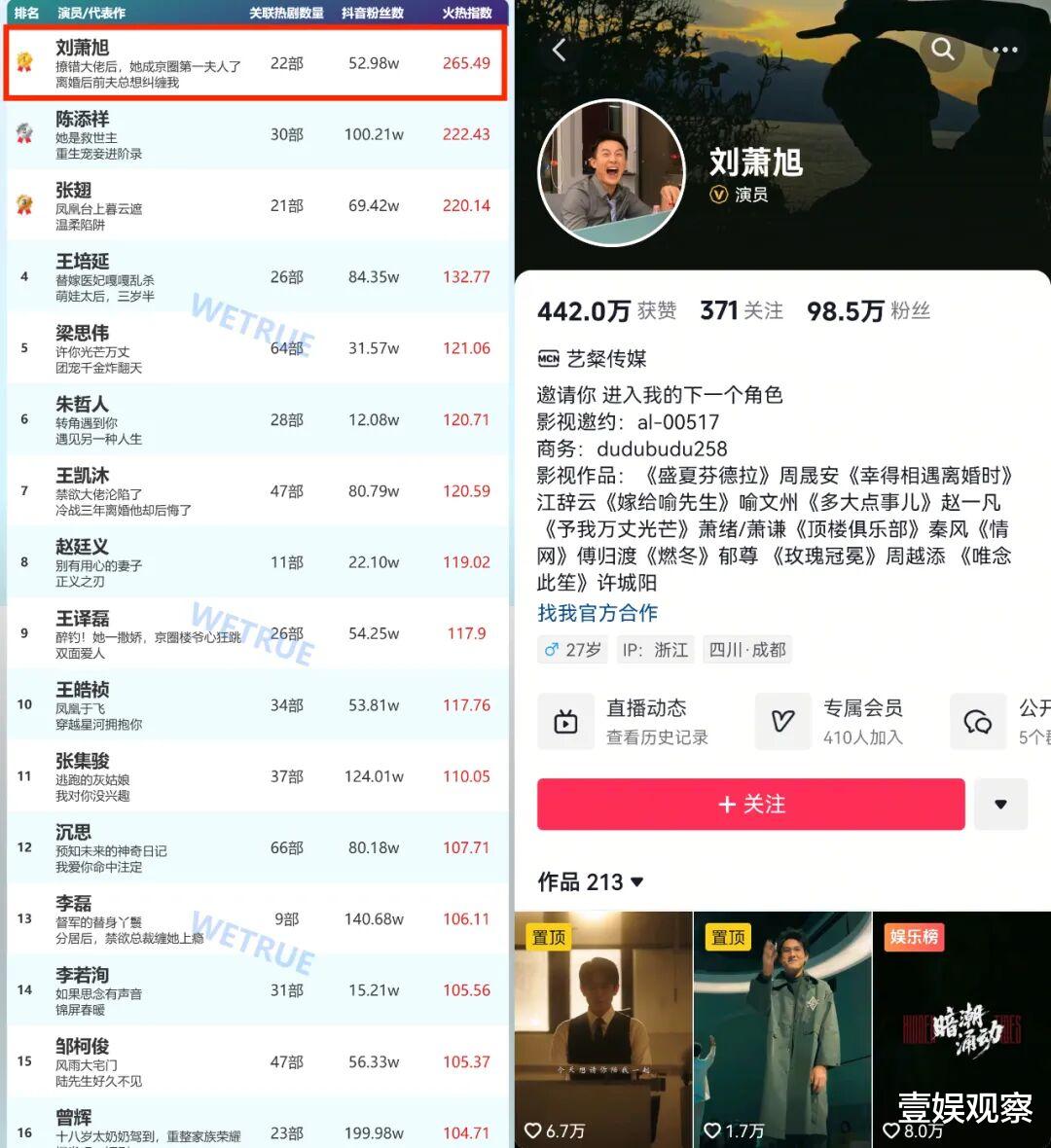 根据WETRUE统计显示,从9月18日起,刘萧旭登顶男演员榜,其火热指数甚至实现断层式领先,而在前一天(9月17日),前五十名甚至没有其身影。刘萧旭抖音粉丝也从8月29日的20万涨至9月24日近100万。