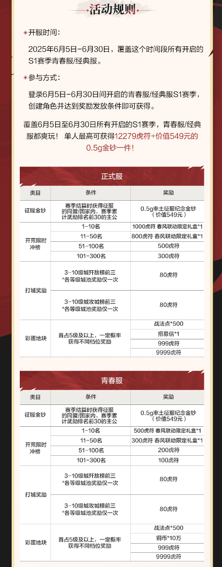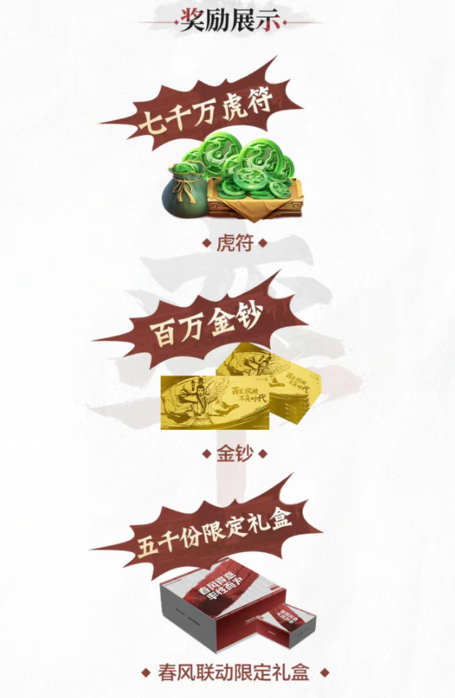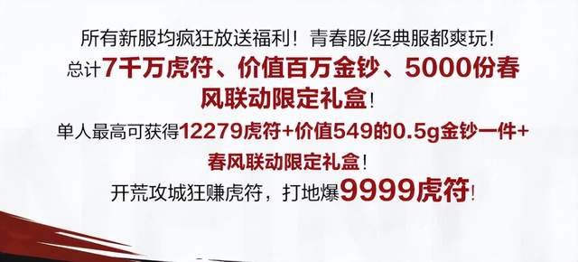 所有在活动期间内入驻新开服务器的玩家,都可以享受到以上的福利待遇,最高单人可以获得12279的虎符奖励和一件0.5克的金钞,外加官方线下邮寄的春风限定礼盒。